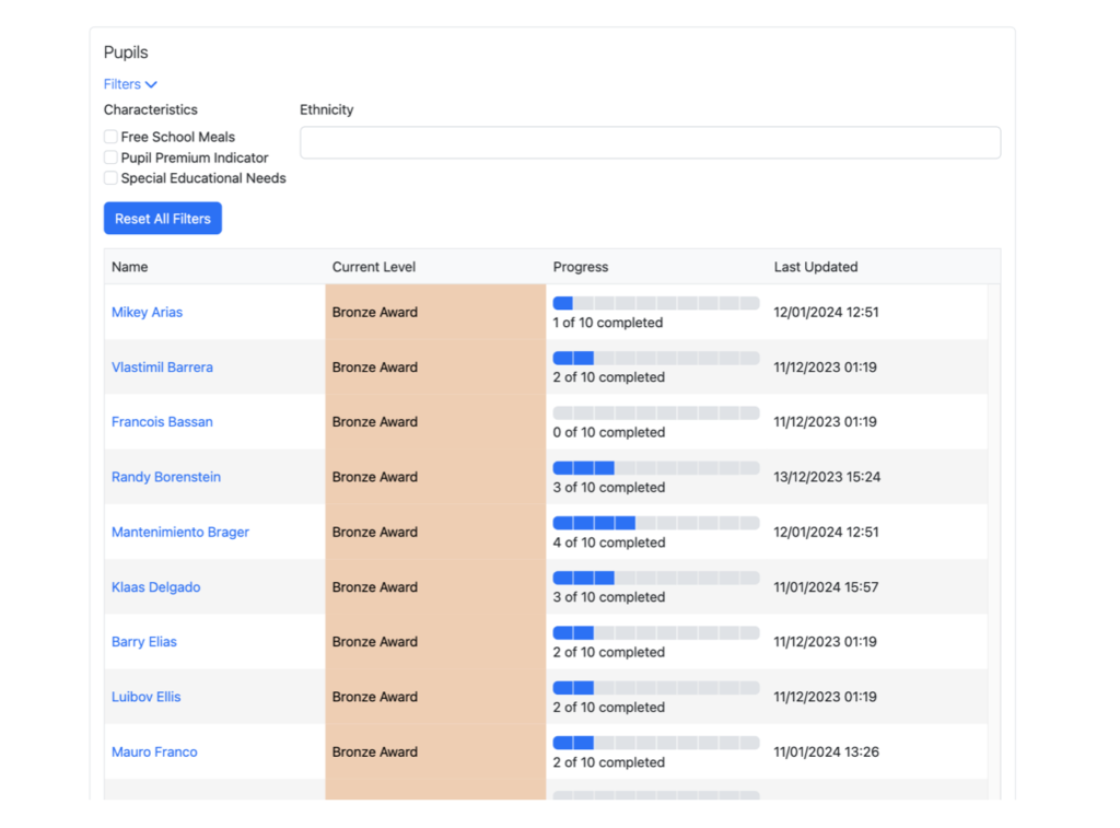 Senior leaders can view student progress towards awards, allowing recognition of achievements to be easily identified and celebrated. Student characteristic data such as FSM, SEN or Pupil Premium can be leveraged to confirm those students are receiving extra support and encouragement, where necessary.